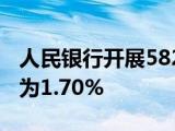 央行今日进行582亿元7天期逆回购操作,中标利率为1 70%,此前为1 80%。iFinD数据显示,今日有1290亿元7天期逆回购到期。文章转载自:互联网 浏览全文>>