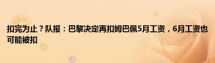 队报表示,面对皇马的冷漠,巴黎单方面决定再扣掉一份奖金。之前是 4 月份工资,现在是 5 月份工资。按此速度,可以想象姆巴佩在巴黎最后一个月工资也将被扣掉。