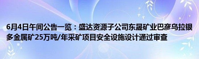 6月4日午间公告一览:盛达资源子公司东晟矿业巴彦乌拉银多金属矿25万吨/年采矿项目安全设施设计通过审查