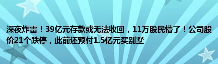 深夜炸雷!39亿元存款或无法收回,11万股民懵了!公司股价21个跌停,此前还预付1.5亿元买别墅