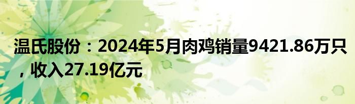 温氏股份:2024年5月肉鸡销量9421.86万只,收入27.19亿元