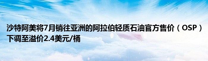 沙特阿美将7月销往亚洲的阿拉伯轻质石油官方售价(OSP)下调至溢价2.4美元/桶。