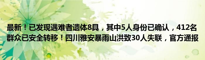 最新!已发现遇难者遗体8具,其中5人身份已确认,412名群众已安全转移!四川雅安暴雨山洪致30人失联,官方通报