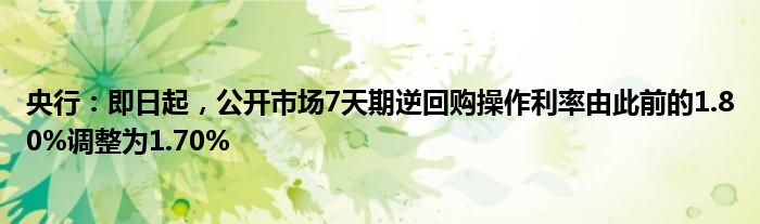 央行:即日起,公开市场7天期逆回购操作利率由此前的1.80%调整为1.70%