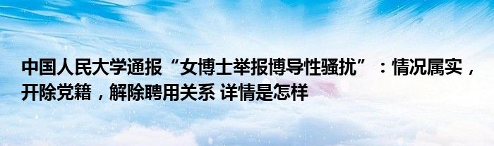 【中国人民大学通报“女博士举报博导性骚扰”:情况属实,开除党籍,解除聘用关系】大家可以一起来了解一下这是什么情况!