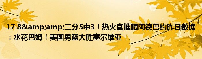 17 8&三分5中3!热火官推晒阿德巴约昨日数据:水花巴姆!美国男篮大胜塞尔维亚