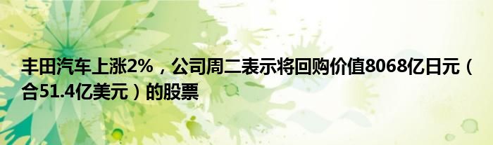 丰田汽车上涨2%,公司周二表示将回购价值8068亿日元(合51.4亿美元)的股票
