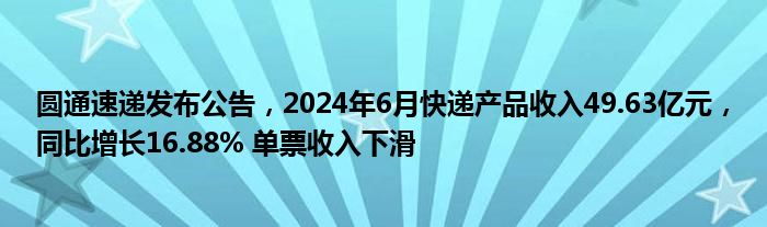 圆通速递发布公告,2024年6月快递产品收入49.63亿元,同比增长16.88% 单票收入下滑