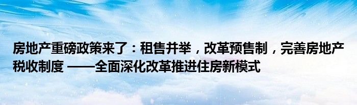 房地产重磅政策来了:租售并举,改革预售制,完善房地产税收制度 ——全面深化改革推进住房新模式