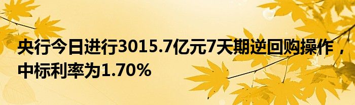 央行今日进行3015.7亿元7天期逆回购操作,中标利率为1.70%