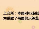 据上交所发布消息,上交所本周对82起拉抬打压、虚假申报等证券异常交易行为采取了书面警示等监管措施,对15起上市公司重大事项等进行专项核 浏览全文>>